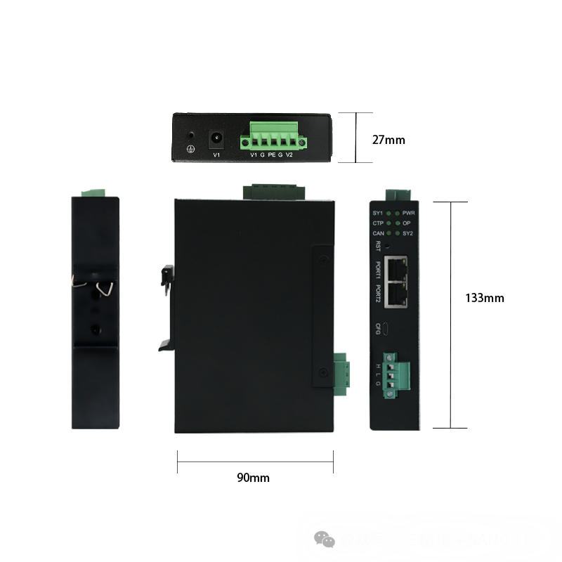 产品参数 9-36V(典型值12V/120mA),支持双电源冗余供电,带过压、过流保护。 2个RJ45以太网接口,支持100BASE-TX/RX,MDI/MDIX自检测,用来组成链式网络。 内置120R终端电阻,通过内部跳线帽使能,带过压、过流保护,最多支持128个CAN设备。 采用EtherCAT从站芯片AX58100。工作在FreeRUN模式。支持COE。 波特率5K-1000K,支持CAN2.0A,接收缓存:100;发送FIFO:3,支持从站数量:20,PDO数量:200,快速SDO数量:100,支持ECAT主站手动NMT管理CANOPEN从站,支持接收紧急报文 波特率5K-1000K,支持CAN2.0B(包含CAN2.0A),接收缓存:100;发送FIFO:3,支持按ID收发数量:200,支持通用收发数量:200,按ID收发+通用收发<=200 硬件介绍 电源接口: 本网关电源接口如下图所示,支持压线端子接法和圆头电源接法,支持双电源冗余供电,支持9-36V输入: 接口符号 参数说明 圆头V1 接圆头电源9-36V(和端子V1不能同时接) 端子V1/V2 接直流9-36V正 G 接直流9-36V负 PE 接大地 指示灯定义: